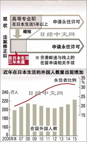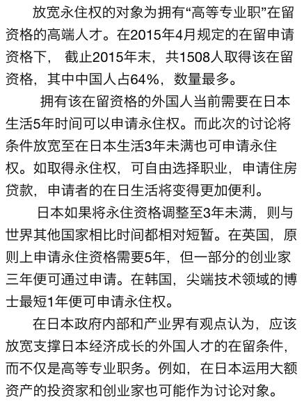 日经中文网报道,日本政府将放宽以外国经营者和研究者等为对象的永住权取得标准,讨论将拥有高知识、高技术的外国人的申请条件从目前在日本生活五年放宽至三年未满。希望以此完善拥有专业知识的高等人才的永住申请体制。日本希望这一策略将更好发挥外国人的研究开发和经营上的技能,促进日本的经济发展。